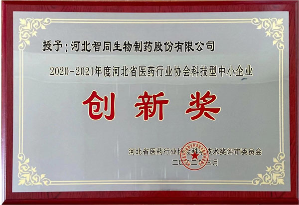 获得河北省医药行业协会2020-2021年度河北省医药行业协会科技型中小企业创新奖